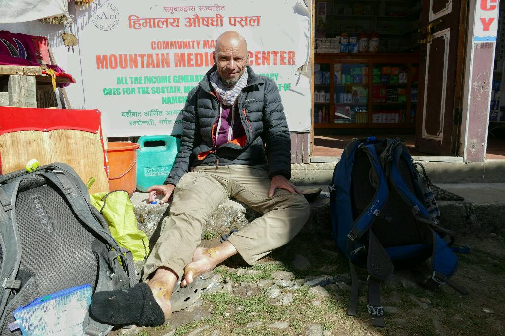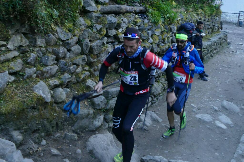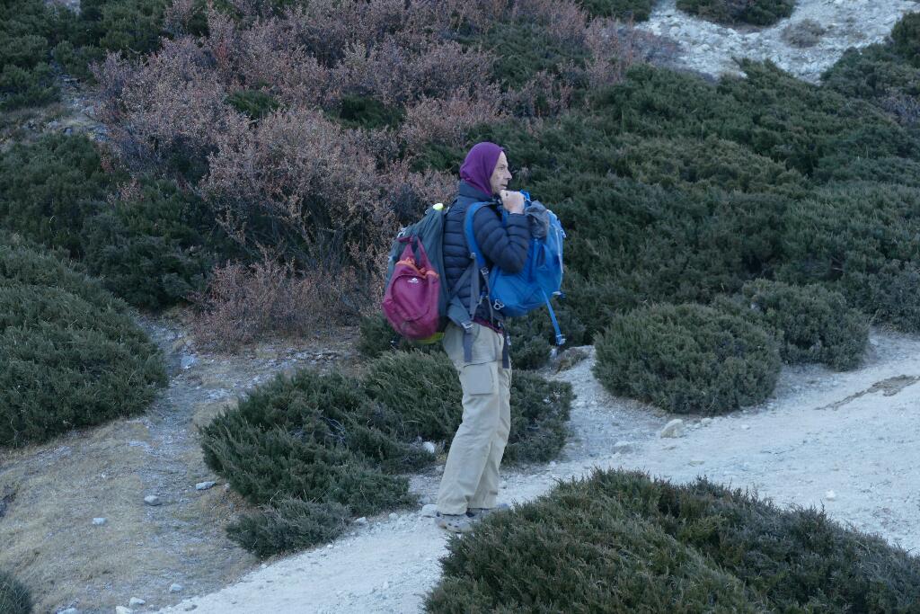 Manu fait ses soins consciencieusement. Ce matin, il a des blessures au niveau des deux narines qui ressemblent à de l’impétigo… Côte à côte, nous reprenons la route. Aussitôt partis, aussitôt en descente dans cette longue pente qui nous a tant fait suer lors de notre arrivée dans le Khumbu. Peu de temps après notre départ, nous croisons des coureurs qui participent à l’Everest Trail Race trail. Impressionnant !