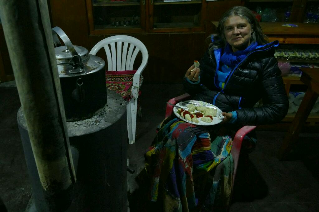 Sur la dernière descente nous rencontrons un népalais qui habite justement à Phortse Thanga (3680m) et qui nous attend à l’entrée du village pour nous indiquer un lodge. En même temps, il aurait été difficile de passer sans voir ce lodge qui se trouve être le seul du village ! Nous allons tout de suite nous doucher (dehors !) car nous voulons nous assurer d’avoir de l’eau chaude. Nous descendons immédiatement dans la salle à manger car il fait très froid dans la chambre. Le feu est allumé, les chaises qui l’entourent déjà occupées alors nous choisissons de nous installer sur une table bien exposée à la chaleur du poêle. Nous commandons un litre de chocolat chaud que nous avons à peine le temps de terminer car ici, le dîner est servi à 18h30.