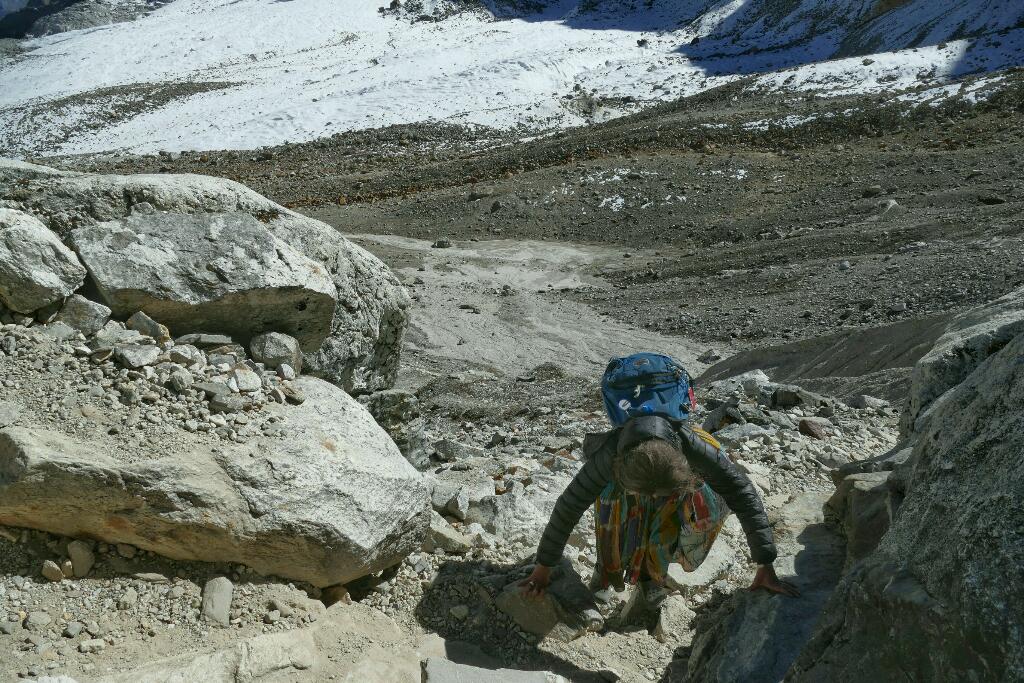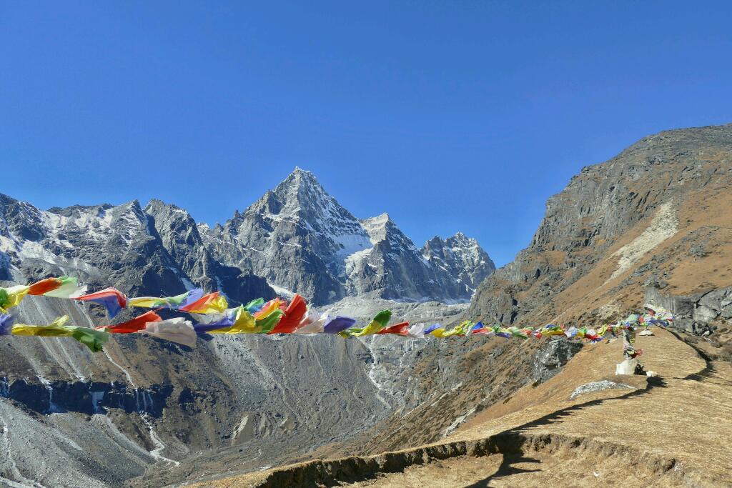 La route du Renjo La étant très accidentée, nous ne croisons pas de caravanes de yacks qui ne peuvent pas facilement l'emprunter. La montée est longue. Le sentier s'amincit et la pente s'accentue. Le pas est de plus en plus lent. Malgré cette lenteur, le cœur bat vite et je dois m’arrêter de plus en plus fréquemment. Que d'énergie ne faut-il pas dépenser pour gagner chaque mètre de dénivellation ! Plus haut, il n'y a plus de sentier. Plutôt, un amoncellement de grosses roches granitiques nécessitant de grandes enjambées pour s'y hisser. Je vois enfin battre au vent les drapeaux à prières marquant le sommet. Je m'arrête encore car par moment, je crois que je n’y arriverai pas. Le cœur bat vite et fort. Je me sens épuisée.