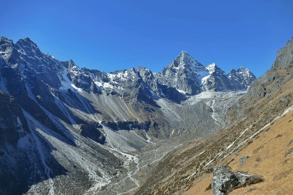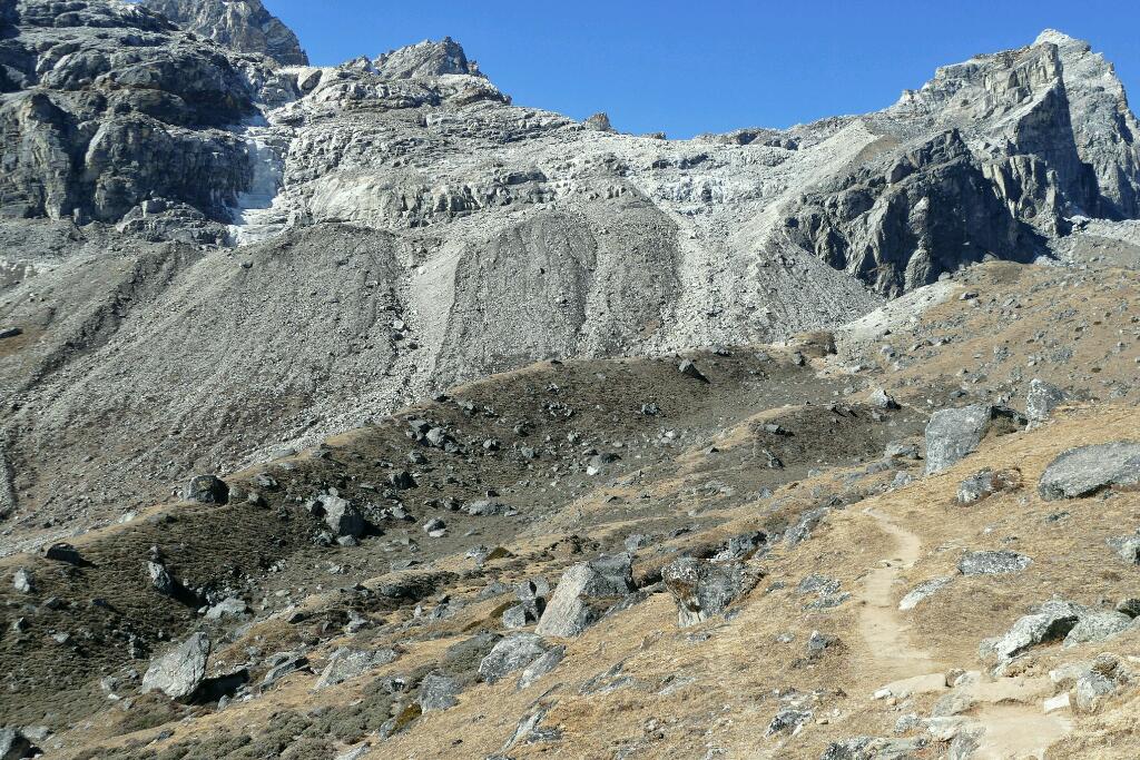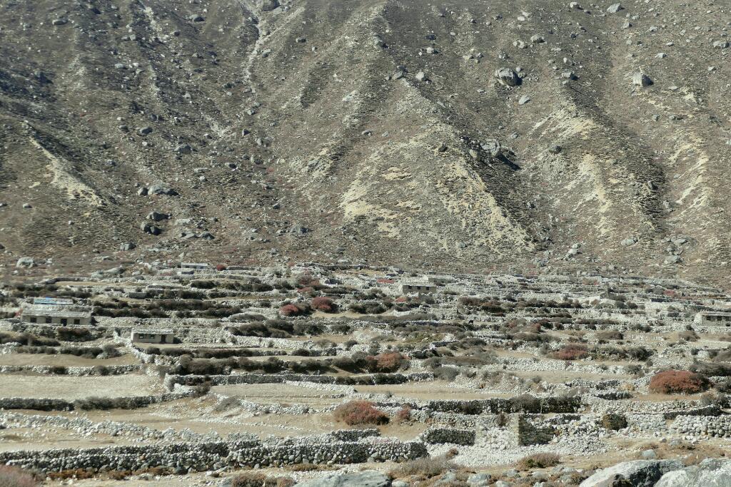 Le paysage est austère. Le sentier traverse des kharkas, pâturages de haute altitude constitués de plusieurs champs contigus de petites dimensions, entourés de murets de pierres. Comme c'est souvent le cas en pays de haute montagne, on pratique ici la transhumance. L’été, les jeunes membres des familles sherpas viennent faire paître leurs troupeaux de yacks dans ces kharkas. À mesure que l'été avance, ils déplacent leurs troupeaux d’une kharka à l’autre, gagnant en altitude à mesure que l’herbe devient rare en bas, et que la neige fond plus haut.