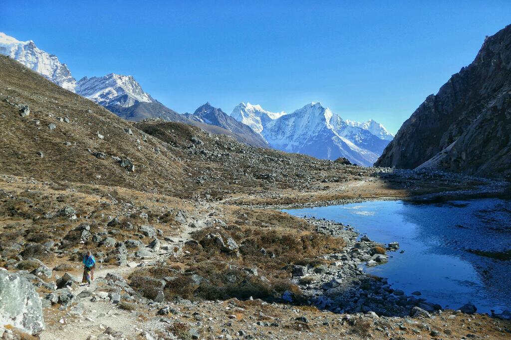 Pour ce trek himalayen, nous avons opté pour un circuit empruntant principalement la vallée de Gokyo. Cet itinéraire longe les rives de la rivière Dudh Kosi et conduit à la kharka de Gokyo. Manu craignait que l’autre option menant à la vallée de Lobuche, laquelle conduit au camp de base de l'Everest et au Kala Pattar soit plus longue et surtout plus touristique.