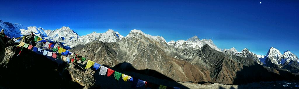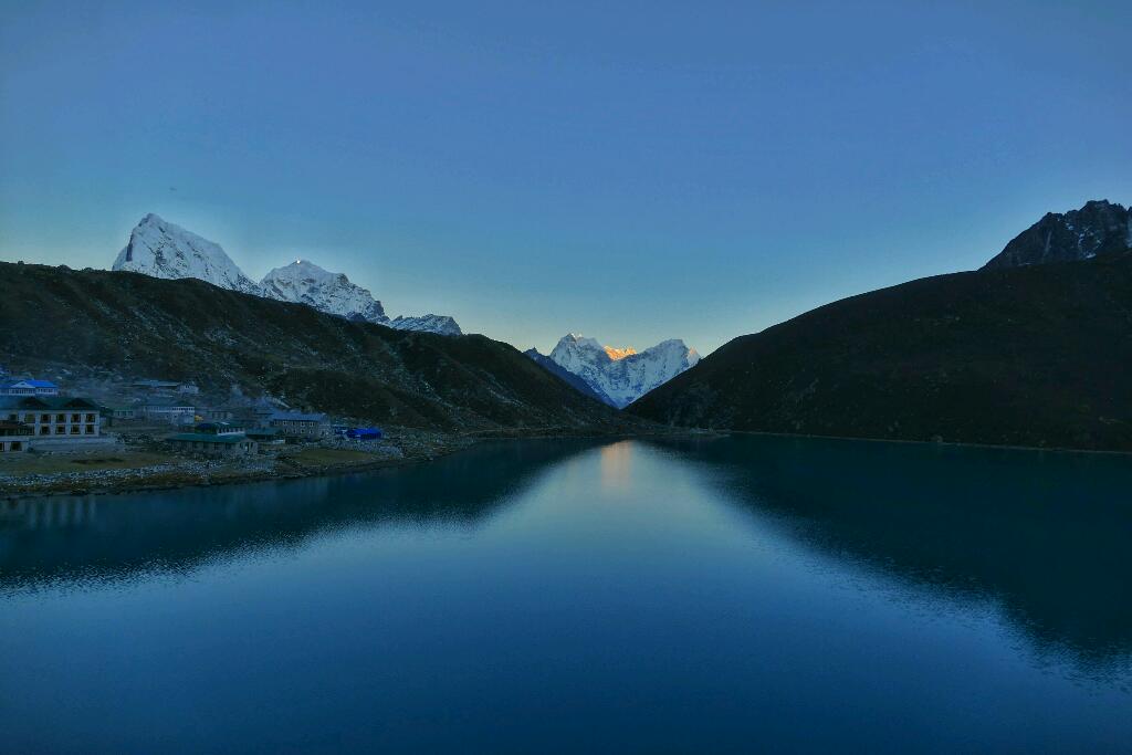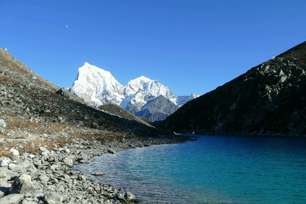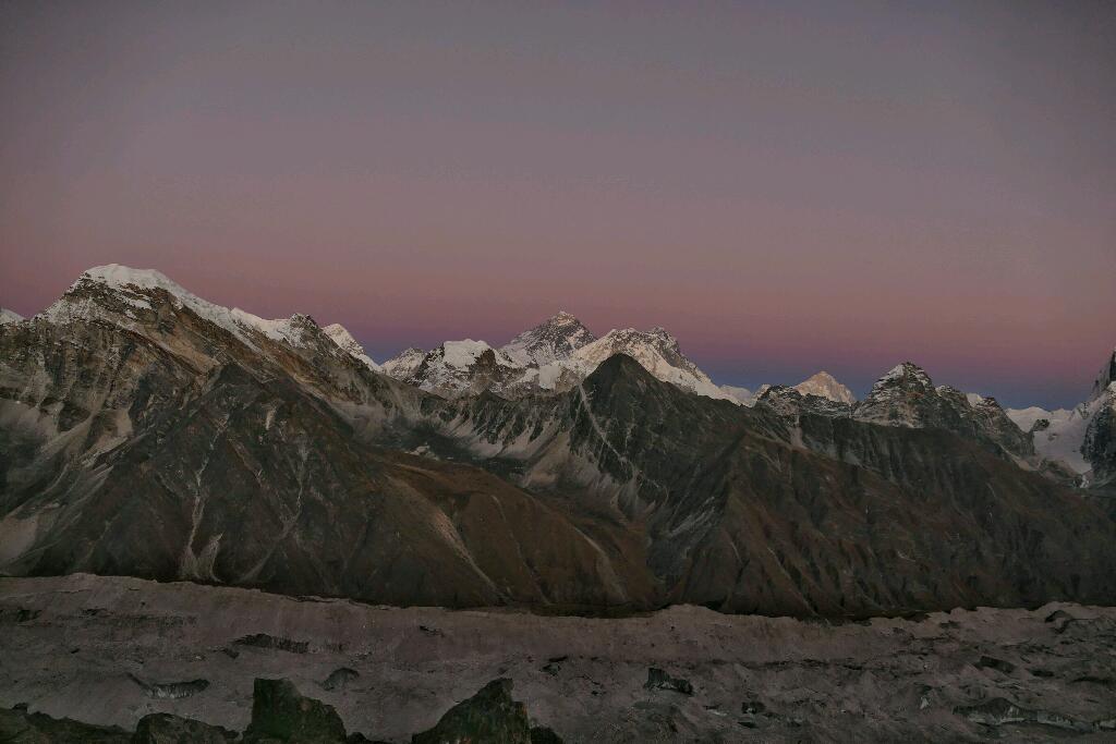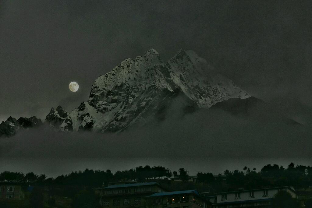 Un autre aspect positif de notre passage au Népal, indirectement lié à celui du climat, est celui du pur spectacle visuel et photographique, en particulier le soir de la sortie au Gokyo Ri, qui nous a valu un ciel dans des nuances de parme absolument magnifique au-dessus du glacier Ngozumpa et de la chaîne de l’Everest. On peut aussi citer les turquoises variables des lacs Gokyo (notamment le plus grand d’entre eux), la présence imposante sur notre droite, pendant une bonne partie de la montée, de l’Ama Dablam, cîme escarpée dominant la vallée de Namche Bazaar, et les vues répétées sur les sommets jumeaux du Lhotse et de l’Everest, que nous avons à ma surprise découvertes dès le lendemain de notre arrivée à Namche. Nous avons également eu de la chance avec la lune, certes pas encore tout à fait pleine au moment de notre passage, mais superbement synchronisée avec la tombée de la nuit, au point d’apparaître souvent au meilleur moment du crépuscule entre les blocs de montagne. Lune qui s’est trouvé par ailleurs être particulièrement grosse dans le ciel du fait de sa proximité avec la Terre (phénomène dit de super lune), et dont la lumière tamisée m’a permis de descendre sans encombre et sans lampe de poche (oubliée) du Gokyo Ri une fois la nuit (largement) tombée.