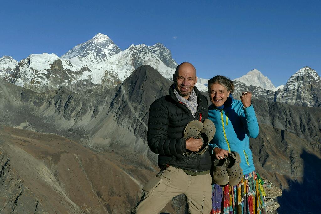 Complètements éreintée, je rejoins Manu. Nous nous tapons réciproquement dans les mains et nous tombons dans les bras l’un de l’autre. À coup de petits pas insignifiants, j’ai réussi à atteindre ce sommet. J’observe le paysage absolument sublime il est vrai mais en même temps, dans une sorte d'état second, je discerne avec clairvoyance tous les efforts déployés pour réaliser cela : un projet à la limite de mes capacités. Jamais de toute ma vie je n’ai dû fournir un tel effort physique.