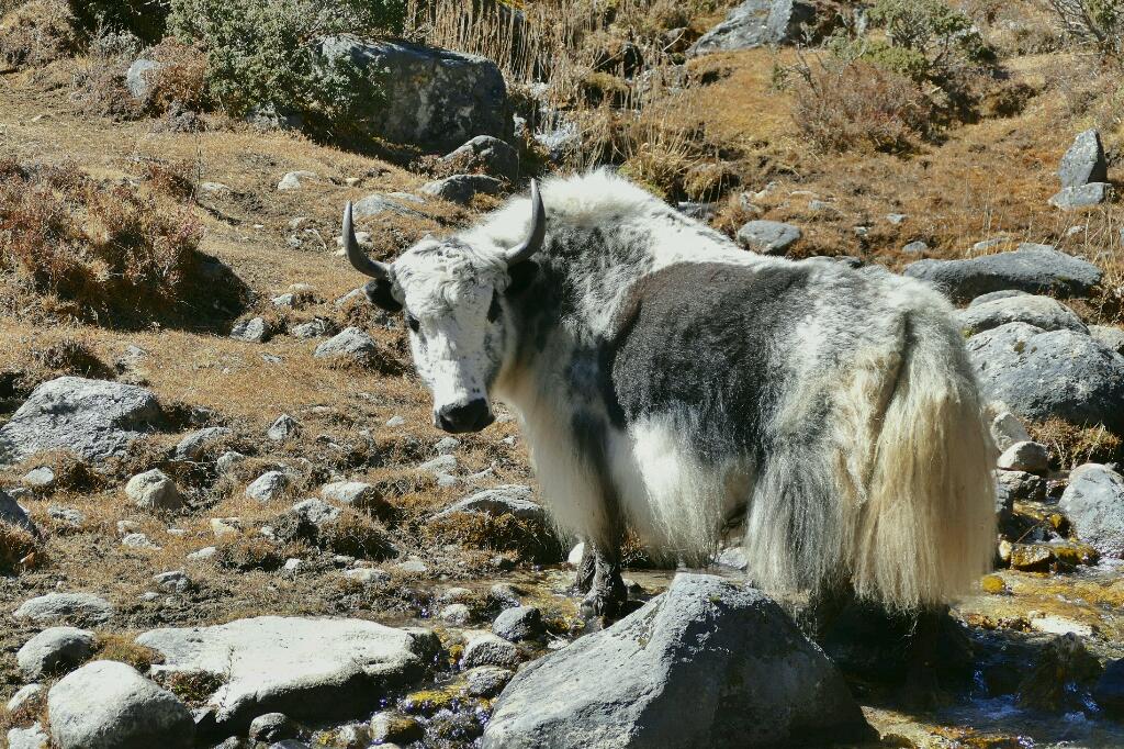 Nous croisons plusieurs caravanes de yacks. Lorsque les yacks ralentissent le pas ou s'arrêtent à notre vue sur l'étroit sentier, un cri du yack-pa ou une petite pierre habilement lancée sur le yack de tête suffit pour remettre la caravane en marche. Nous dégageons rapidement le sentier en nous rangeant du mieux que l'on peut le long de la paroi tandis que les yacks reprennent le pas en longeant le bord du précipice.