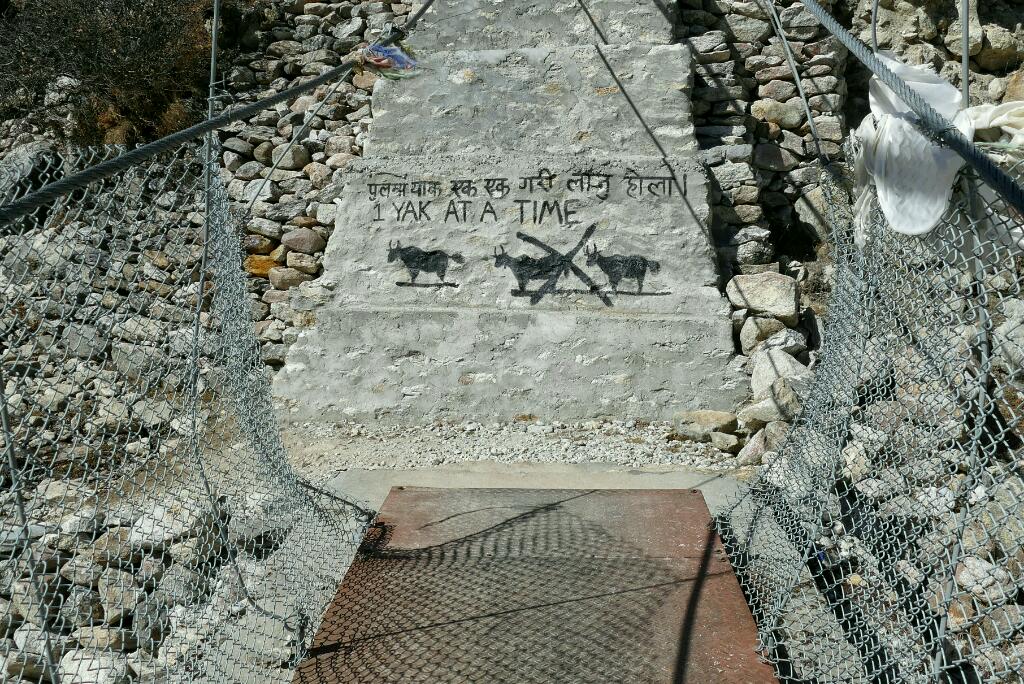 L’inscription qui figure sur une pierre nous fait sourire. Un yack à la fois seulement sur ce petit pont suspendu que nous pensons devoir emprunter!