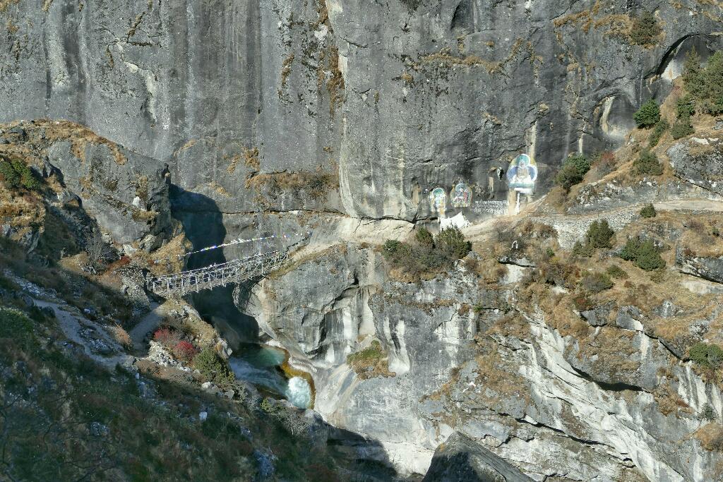 Le sentier commence par une belle descente vers le sud-est sur un versant raide dominant la rivière Bhote Koshi de plusieurs centaines de mètres. Au loin retentit un grondement sourd, et soudain nous apercevons un pont qui surplombe la rivière, véritable torrent alimenté par des quantités d'eau incroyable !