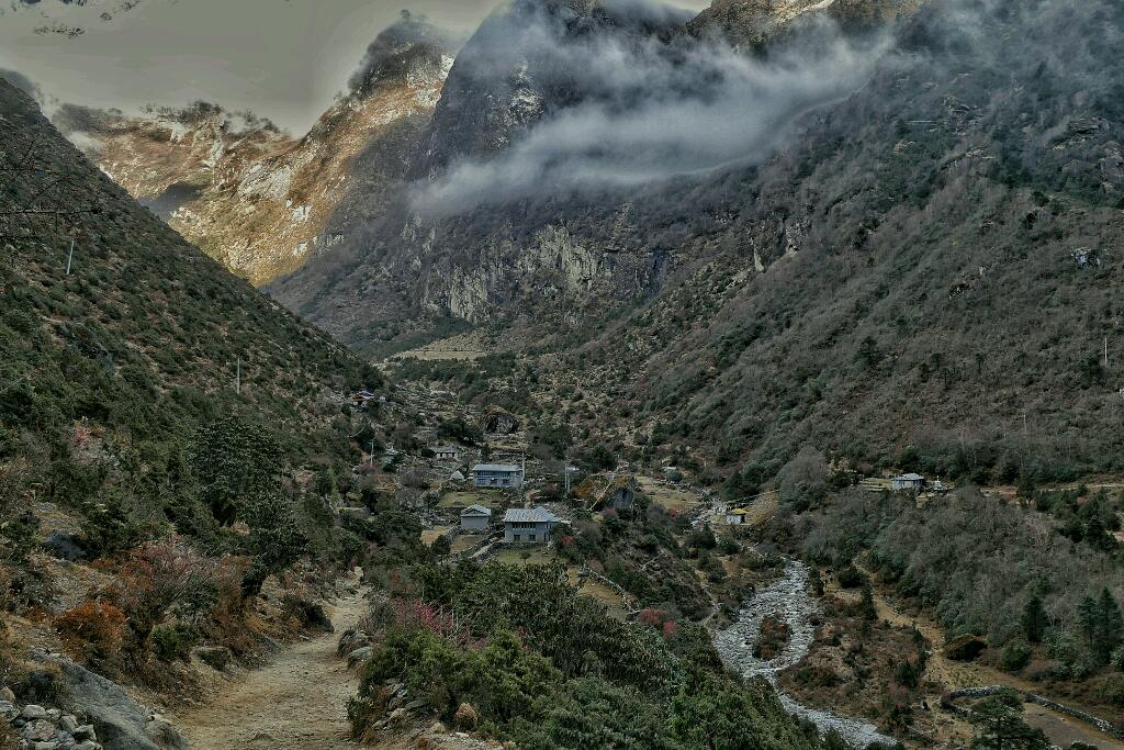 Puis le sentier traverse Tenga (Tongba), Dhole, Gyele (Kele). En chemin, les vues sur le Khumbila (5 761 m) et le Taboche sont superbes.