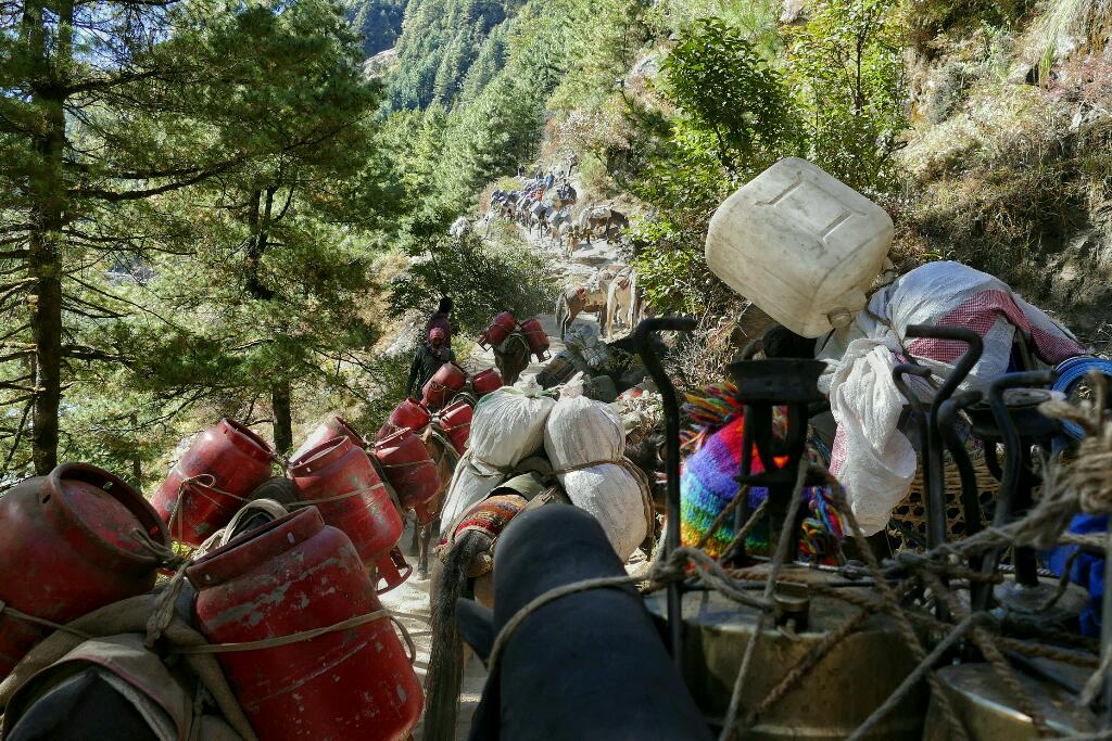 Nous devons nous arrêter régulièrement car nous avons le même rythme qu’une caravane de mules qui peine à en croiser d’autres lors des passages étroits. Nous croisons les nouveaux trekkeurs qui montent. Ils n'ont pas encore cette fierté de ceux qui "ont fait" et qui "ont vu". Nous saluons donc allègrement de « namaste » encourageants les marcheurs essoufflés qui, sous un soleil ardent, grimpent péniblement derrière ces caravanes.
