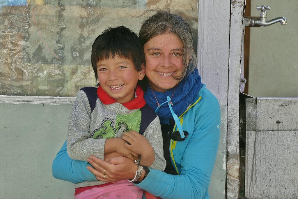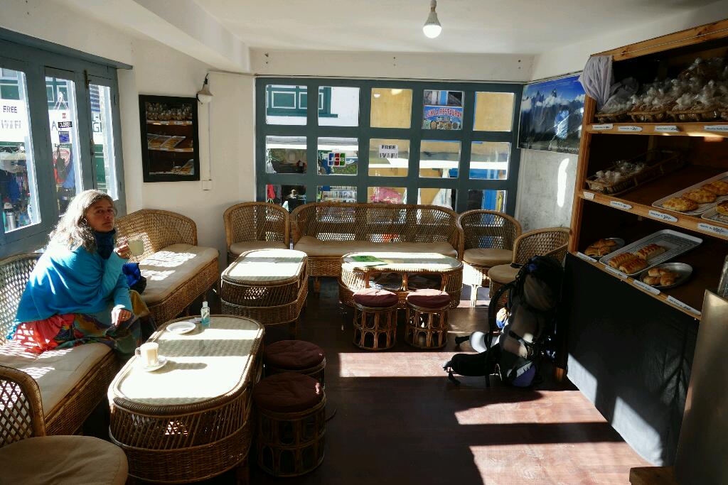 Nous nous arrêtons dans un lodge pour déjeuner à l’extérieur sur une terrasse un peu ensoleillée. Un petit garçon sherpa timide au début mais curieux finit par nous tenir compagnie pendant le repas.