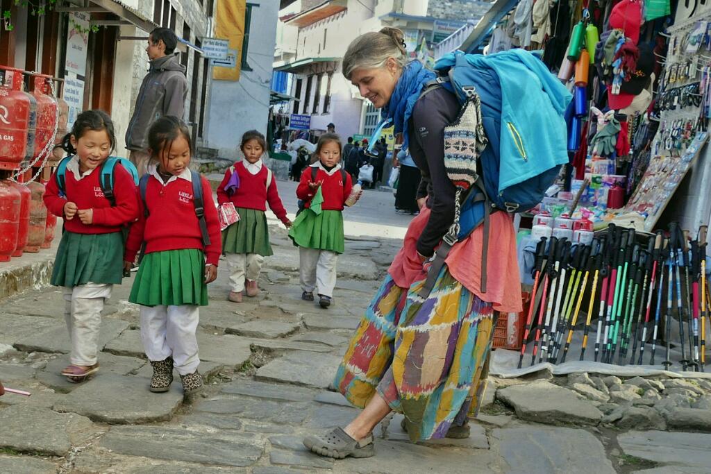 Nous croisons des petites filles qui rentrent de l’école et qui me dévisagent de la tête aux pieds à cause de ma jupe et de mes Crocs, comme je l’ai été des dizaines de fois par jour lors de ce trek par les habitants des villages, les porteurs et les trekkeurs.