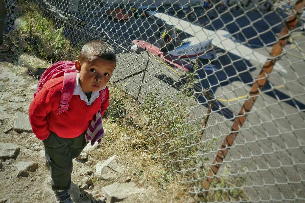 Nous passons devant une courte piste d’atterrissage en terre, située un peu plus haut. Ce petit aérodrome est essentiellement utilisé par les touristes japonais, qui arrivent directement ici pour rejoindre l’Everest hôtel, situé à quelques minutes d’ici, et d’où l’on peut apercevoir l’Everest. J’ai lu quelque part que les japonais font parfois l’aller-retour sur quelques heures à partir de leur pays (en avion puis hélicoptère), le temps de prendre une photo avant de repartir…