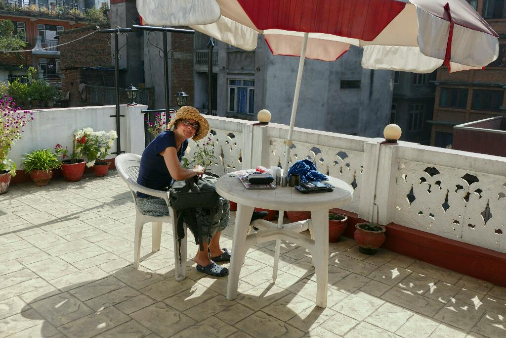Sur la terrasse du toit de notre hôtel, je couds les écussons que nous avons achetés à Namche sur nos sacs tout en cherchant sur Google des sites liant Montessori et Katmandou, ayant eu mon attention attirée sur ce point par un véhicule entrevu un peu plus tôt sur un boulevard de la ville. Je trouve plusieurs établissements qui appliquent cette pédagogie. Je rentre en contact avec l’un d’entre d’eux via Facebook mais je ne donnerai pas suite car je ne vois, dans leur site, pas grand-chose de plus qu’une « garderie » basique. Je préfèrerais aller en visiter un autre mais Manu juge qu’il se situe trop loin de notre lieu de résidence.