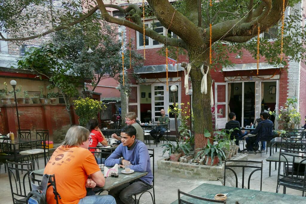 En approchant de Thamel, les rues deviennent plus étroites. J'ai l'impression que nous circulons en voiture au milieu de rues piétonnières bondées de passants. Notre taxi se faufile à travers cette masse grouillante en klaxonnant et nous arrête au bout d’une toute petite rue qu’il ne peut pas emprunter. Nous terminons à pied, nous passons un portail et débouchons dans une cour. Notre hôtel, le Kathmandu Boutique Hôtel, se trouve là, entouré d'un jardin. Je jette un regard autour de moi. Je ne rêve plus, je suis bien au Népal.