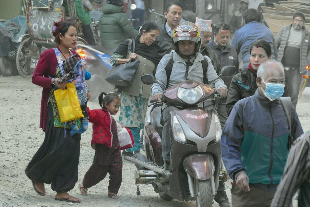 Dès notre arrivée, nous retirons des devises népalaises qui nous permettent de pré-payer un taxi qui nous conduit directement à Chhetrapati où nous espérons trouver un hôtel. Chhetrapati est limitrophe avec Thamel, le quartier touristique de Katmandou, lieu de rendez-vous des adeptes de la montagne. Ici, on roule à gauche, à la manière britannique. C’est le choc : des rues cahoteuses et poussiéreuses, de vieilles maisons délabrées avec terrasses sur les toits, des petites échoppes ouvertes sur la rue où l'on entasse, vend, répare toutes sortes de choses. On croise des hommes chargés comme des mulets déambulant à petits pas, des femmes en sari aux couleurs chaudes tâchant de se frayer un chemin sur la chaussée à travers vaches sacrées et tas de détritus. La plupart sont munis de masques pour lutter contre la poussière.
