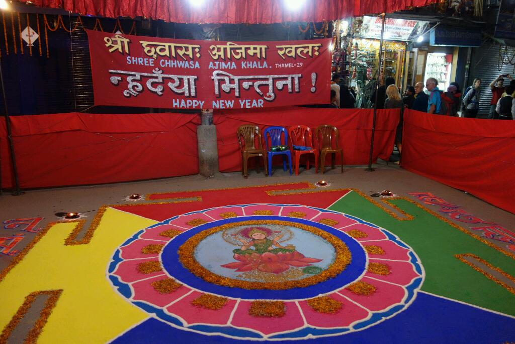 Le quatrième jour est un peu différent : Ce jour commence la nouvelle année Néwar. Nous y voilà, on a la réponse à l’inscription au-dessus de la fresque ! Le Népal a de nombreux calendriers mineurs utilisés par différentes ethnies, le calendrier Néwar est l’un de ceux-là. Cependant la nation utilise habituellement le calendrier « Bikram Shambat ».
