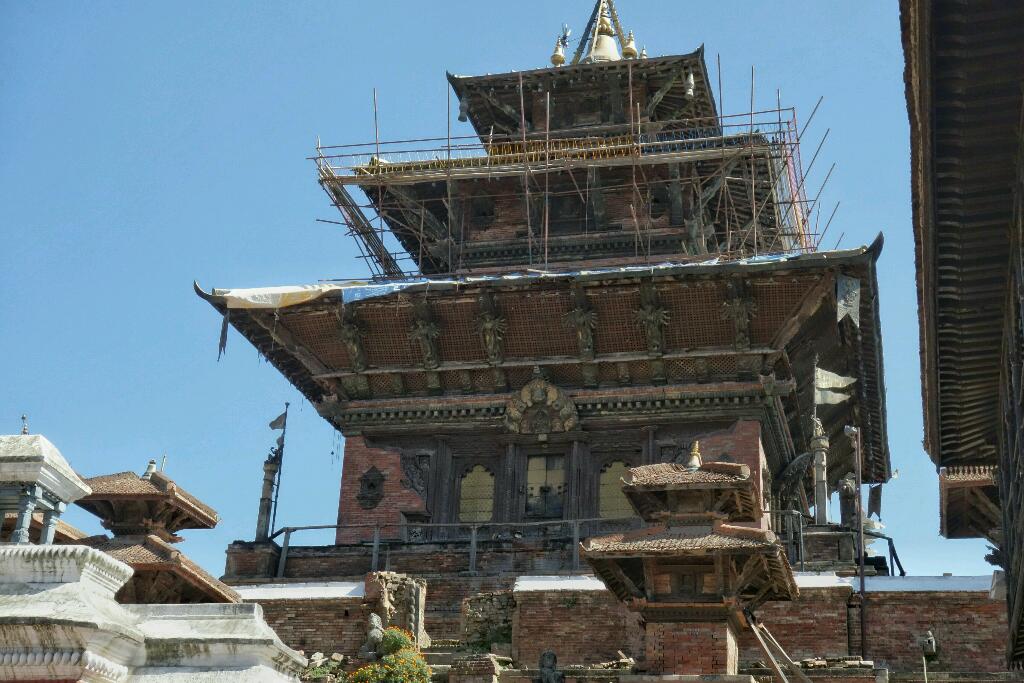 Nous effectuons le chemin du retour à pied, ce qui nous permet dans un premier temps d’emprunter des quartiers uniquement népalais avant de nous rendre dans le coin plus touristique puisque nous visitons Durbar Square. Durbar Square rassemble de nombreux temples dédiés aux dieux Shiva, Vishnu, Ganesh, Bhairab, aux déesses Taleju et Parvati et aux innombrables autres divinités composant le panthéon hindouiste; des temples petits et grands, en briques ou en pierres, carrés ou rectangulaires, à deux, trois ou quatre toits superposés, dont la plupart sont manifestement mal entretenus ou en reconstruction depuis le tremblement de terre.