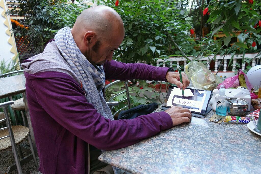 Je suis tout de même réveillée à 5h45…donc petite nuit pour moi. Nous restons toute la matinée dans le jardin de l’hôtel à travailler (le traitement des photos, le téléchargement, l’écriture du carnet, tout cela prend vraiment beaucoup de temps et nous avions énormément de retard).