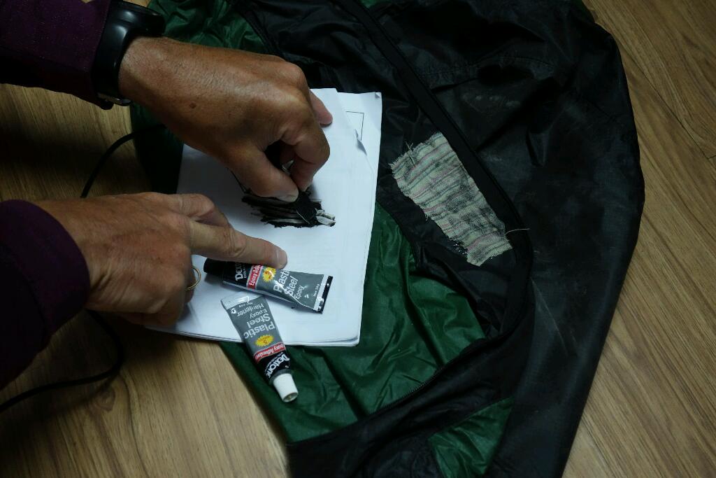De retour à l’hôtel, nous préparons nos sacs pour demain. Manu répare le sac de plongée avec sa chemise indienne bleue. A la fin de l’Inde, elle était trouée en bas d’une manche. Le petit trou est devenu tellement grand qu’il en devenait gênant alors à Tentena, la petite dame de l’hôtel Victory nous avait prêté une paire de ciseaux et nous avions raccourci la manche qui depuis, s’effiloche. Puis c’est un trou dans le dos qui est apparu. Bref, elle commençait à être très usée. On en rachètera une à notre retour de trek. Tout à l’heure, nous avons acheté une paire de ciseaux pour découper (snif) un petit morceau de cette chemise "historique" pour réparer le sac… Espérons maintenant que cette réparation tienne un peu mieux que la précédente, et que le sacrifice n'aura pas été vain.