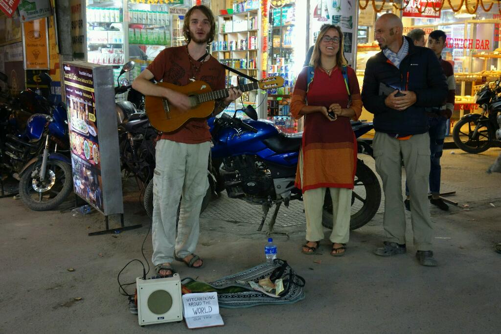 Il est moins tard qu’hier quand nous sortons pour dîner, ce qui nous laisse le temps de faire quelques emplettes. Nous nous achetons chacun un pull en Cashmire car nous craignons d’avoir un peu froid pendant le trek, des bonnets, des fruits secs supplémentaires (Manu a toujours peur de manquer) avant de nous diriger vers un restaurant recommandé par le Lonely Planet (le Gaïa) et qui s’est avéré un bon choix. Nous donnons quelques roupies à un couple de jeunes allemands dont le garçon chante à la guitare pour contribuer au financement de leur tour du monde.