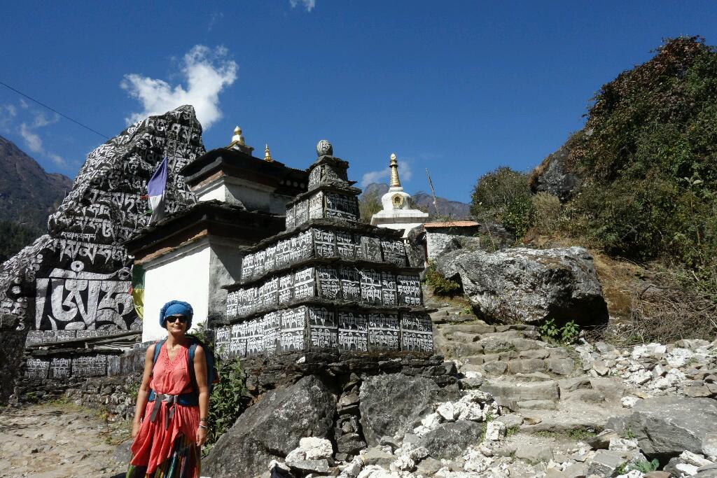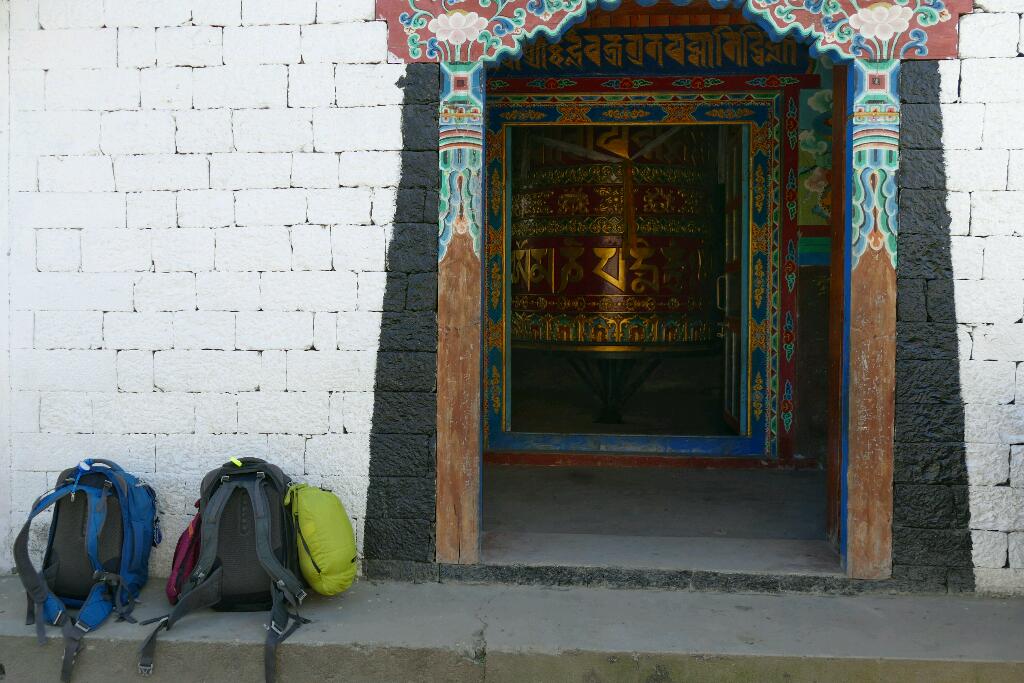 Nous nous arrêtons prendre un petit déjeuner à la sortie du village avant d’entamer notre première marche. À la sortie du village, nous contournons par la gauche un mur de pierres mani. Au Népal, la main gauche étant considérée impure, il est impératif de contourner par ce côté, tous les bâtiments et monuments sacrés, afin qu’ils soient situés à main droite.